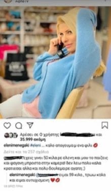 Τότε η Ελένη Μενεγάκη που από ότι φαίνεται παρακολουθεί τα περισσότερα σχόλια που της κάνουν έσπευσε να απαντήσει: «Είμαι 59 κιλά, τρώω καλά και είμαι ευτυχισμένη».