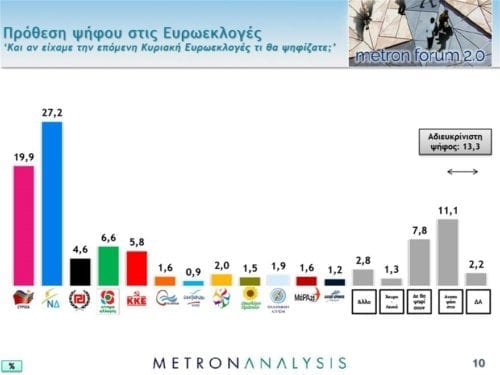 Σαφές προβάδισμα της Νέας Δημοκρατίας σε ευρωεκλογές και εθνικές εκλογές και μάλιστα με αυτοδυναμία, έδωσε η νέα δημοσκόπηση της Metron Analysis που παρουσιάστηκε στο κεντρικό δελτίο ειδήσεων του Alpha.