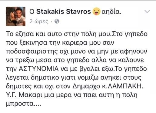 Μέσα από την προσωπική του σελίδα στο Facebook ο πρώην ποδοσφαιριστής της Ξάνθης, ΑΕΚ αλλά και της ΠΑΕ Θράκης, Σταύρος Σταθάκης , κατήγγειλε πως δεν του επιτράπηκε να τρέξει στο στάδιο “Φώτης Κοσμάς”. Και όχι μόνο δεν τον άφησαν να τρέξει (όπως ήθελε) αλλά όταν αρνήθηκε να αποχωρήσει του… έφεραν την αστυνομία !