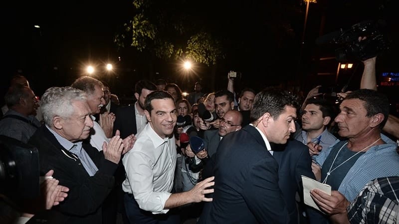 Ο πρωθυπουργός και πρόεδρος του ΣΥΡΙΖΑ, Αλέξης Τσίπρας, έφτασε στα γραφεία του κόμματος λίγο μετά τις 21:15, συνοδευόμενος από την σύντροφό του, Μπέττυ Μπαζιάνα. Χαρακτηριστικό μάλιστα ήταν το στιγμιότυπο με τον διοικητή του ΟΑΣΘ, Στέλιο Παππά, να αγκαλιάζει και να φιλά την κυρία Μπαζιάνα, λέγοντάς της: «Χαμογέλα, έχουμε πολύ δρόμο ακόμα».