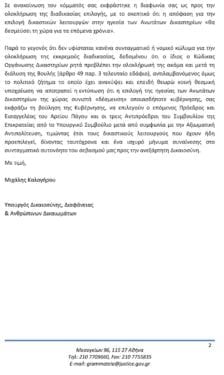 Γνωρίζετε άλλωστε ότι την άποψη αυτή έχουν ήδη διατυπώσει δημοσίως διακεκριμένοι συνταγματολόγοι και καθηγητές Νομικής, χαρακτηρίζοντας «προκλητική περιφρόνηση του Συντάγματος ως προς το πνεύμα και το γράμμα του» τον διορισμό της ηγεσίας των ανωτάτων δικαστηρίων από μια κυβέρνηση η οποία προκηρύσσοντας εθνικές εκλογές επί της ουσίας έχει ήδη παραιτηθεί.