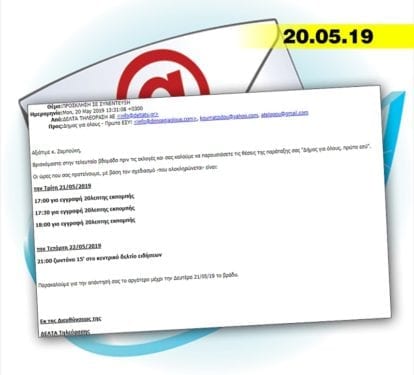 1. Την επιστολή-πρόσκληση προς τον Επικεφαλής της παράταξης Δήμος για όλους. Πρώτα ΕΣΥ, Κο Γιάννη Ζαμπούκη, για να μας ενημερώσει ποια μέρα και ποια ώρα επιθυμεί να προγραμματίσει την συνέντευξη του στην Δέλτα Τηλεόραση, πριν τον 1ο γύρo των Αυτοδιοικητικών Εκλογών. Ο Κος Ζαμπούκης ΠΟΤΕ ΔΕΝ ΑΠΑΝΤΗΣΕ στην συγκεκριμένη επιστολή.