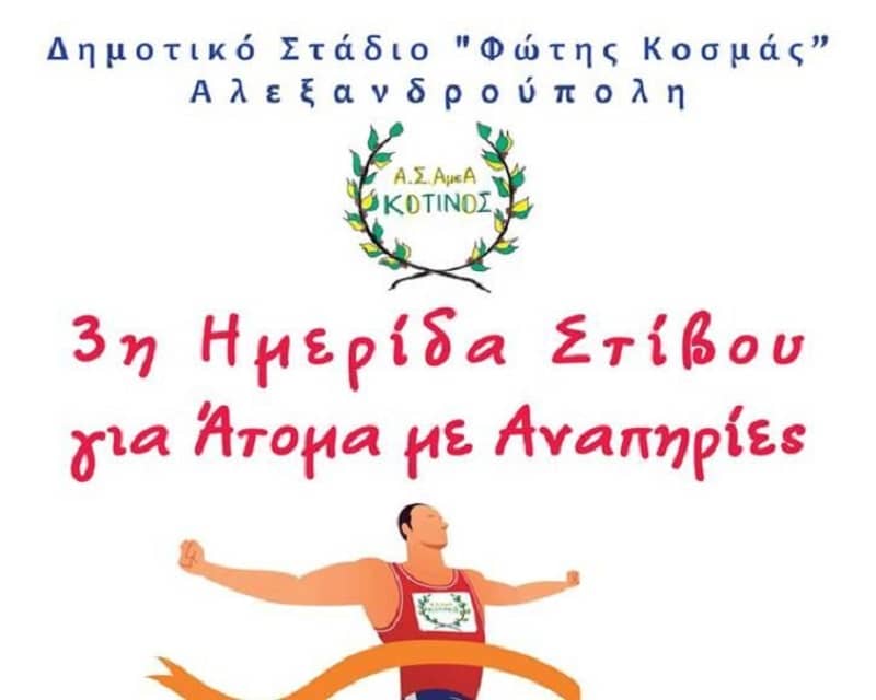 Την τρίτη συνεχόμενη ημερίδα στίβου διοργανώνει στην Αλεξανδρούπολη ο Αθλητικός Σύλλογος Ατόμων με Αναπηρία Έβρου «Κότινος». Η ημερίδα θα γίνει στο δημοτικό στάδιο «Φώτης Κοσμάς», την Πέμπτη 6 Ιουνίου, στις 6:30 το απόγευμα.