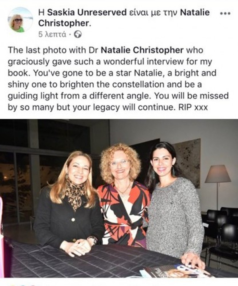 Μόλις μαθεύτηκε η είδηση πως η Νάταλι Κρίστοφερ είναι νεκρή, δεκάδες φίλοι της έσπευσαν να εκφράσουν την οδύνη τους με μηνύματα στα social media. Η αστροφυσικός ήταν ένα πολύ δραστήριο άτομο που της άρεσε το τρέξιμο, κάτι που εκτός από τις φωτογραφίες της στο διαδίκτυο, φαίνεται και από τα πρόσωπα που έγραψαν για τον χαμό της στα social. Γκρουπ όπως «Women of Europe», το «Women fit for business», αλλά και το Cyprus Trail Runners, έγραψαν για τον χαμό της κοπέλας που δραστηριοποιούνταν με ότι είχε να κάνει με fitness στη Κύπρο, όπου έμενε τον τελευταίο χρόνο, μαζί με τον σύντροφό της.