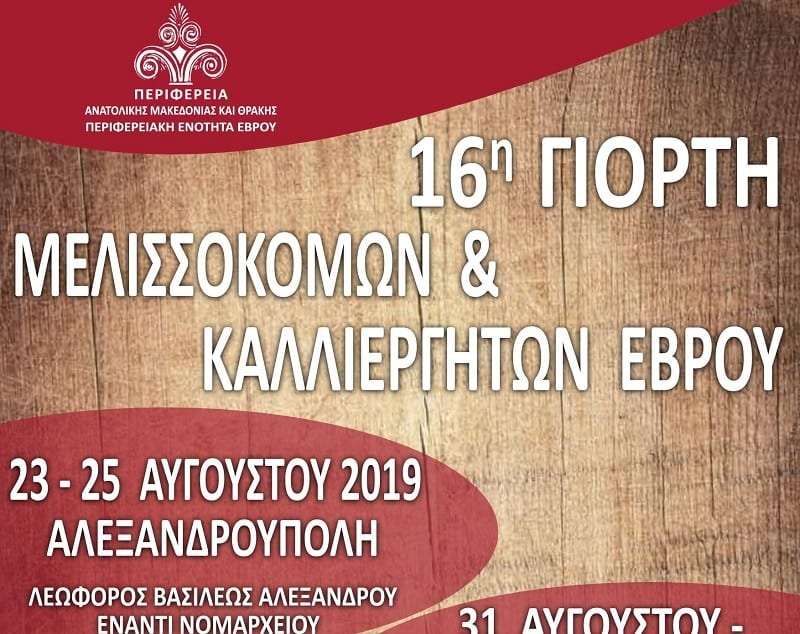 Για 16η χρονιά η Περιφέρεια Ανατολικής Μακεδονίας και Θράκης – Περιφερειακή Ενότητα Έβρου διοργανώνει τη «Γιορτή Μελισσοκόμων & Καλλιεργητών Νομού Έβρου» σε συνεργασία με Συλλόγους μελισσοκόμων και καλλιεργητών της Περιφέρειας, από την Παρασκευή 23 έως και την Κυριακή 25 Αυγούστου στην Αλεξανδρούπολη, στη Λεωφόρο Βασιλέως Αλεξάνδρου έναντι του ΝΟΜΑΡΧΕΙΟΥ, και το Σάββατο 31 Αυγούστου και την Κυριακή 1η Σεπτεμβρίου 2019, στη Νέα Ορεστιάδα, στην Πλατεία Δασίου (κεντρική πλατεία).