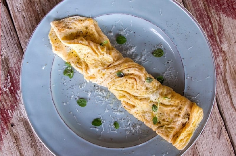 Δε γυρνάμε την ομελέτα. Με ένα κουτάλι παίρνουμε την άκρη, την πάμε προς τα μέσα και το κενό το καλύπτουμε με το αυγό που δεν έχει ακόμα ψηθεί.