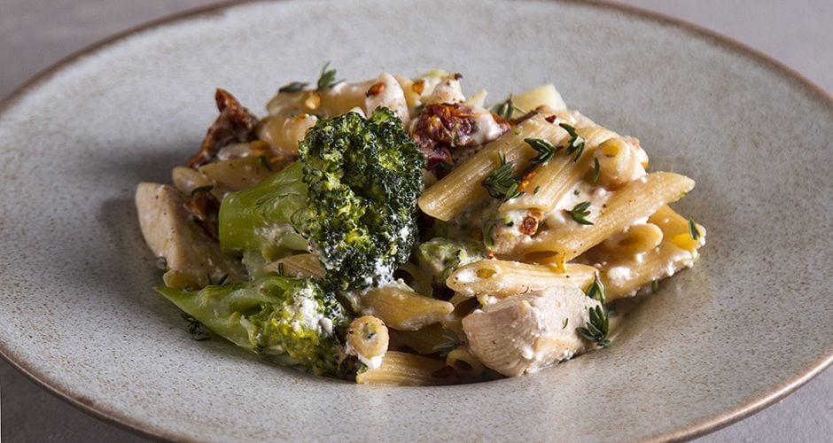 Στη συνέχεια, με μία τρυπητή κουτάλα ρίχνουμε τις πένες και το μπρόκολο στο τηγάνι με τα υπόλοιπα υλικά. ΠΡΟΣΟΧΗ: δεν ξεπλένουμε τα ζυμαρικά με κρύο νερό. Τα ρίχνουμε κατευθείαν στο τηγάνι.