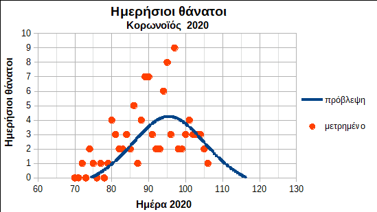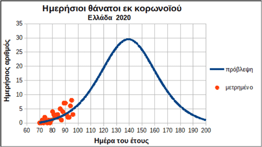 Από την οπτική γωνία ενός πολίτη έξω από το σύστημα υγείας, που παρακολουθεί και καταγράφει καθημερινά τα αποτελέσματα του κορωνοϊού που δηλώνονται, είχε υπολογιστεί ένα μοντέλο εξέλιξης της άγνωστης αυτής ίωσης που παρουσιάζεται στο Διάγραμμα 1 με στοιχεία μέχρι την 95η ημέρα του έτους (4/4/2020).