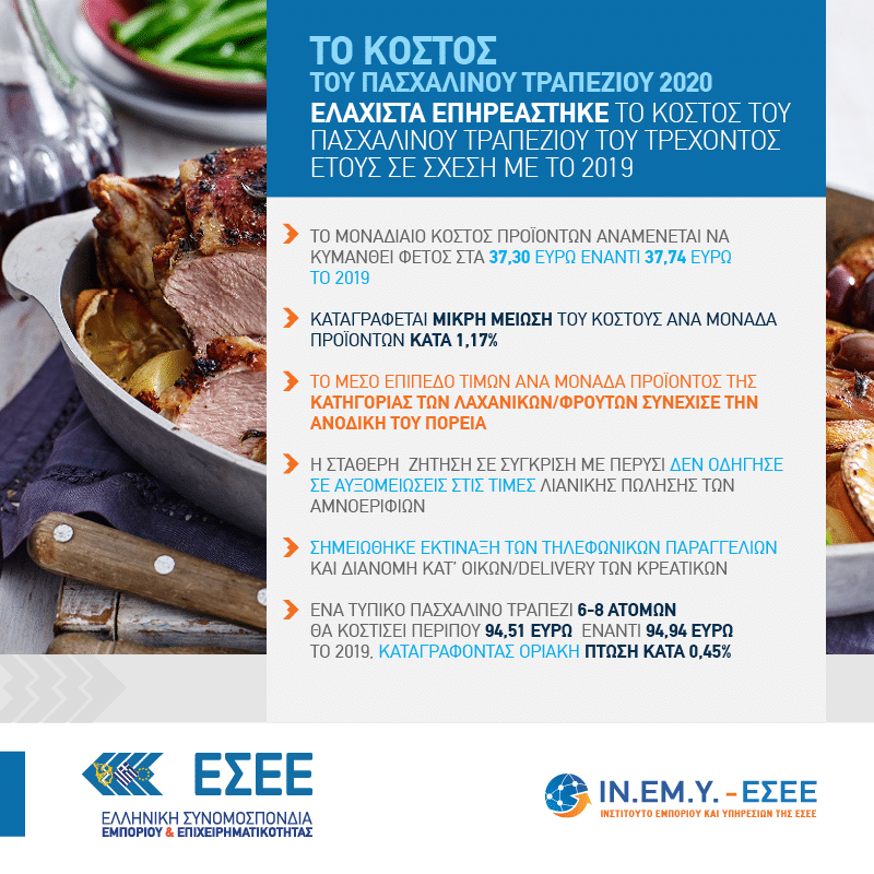 Σύμφωνα λοιπόν με μετρήσεις που διεξήγαγε το ΙΝ.ΕΜ.Υ. – ΕΣΕΕ την περίοδο 13-15/4/2020, το μοναδιαίο κόστος των προϊόντων που απαρτίζουν το καθιερωμένο πασχαλινό τραπέζι αναμένεται να κυμανθεί φέτος στα 37,30 ευρώ έναντι 37,74 ευρώ το 2019. Προκύπτει συνεπώς, μία μικρή μείωση του κόστους ανά μονάδα προϊόντων κατά 1,17% ή κατά 0,44 ευρώ, η οποία απορρέει κατά βάση από τα φθηνότερα προϊόντα που προμηθεύεται το καταναλωτικό κοινό από τα Supermarkets. Στον αντίποδα, όπως άλλωστε και πέρυσι, το μέσο επίπεδο τιμών ανά μονάδα προϊόντος της κατηγορίας των λαχανικών/φρούτων συνέχισε την ανοδική του πορεία. Ενώ οι τιμές των κρεατικών, βάσει των δειγματοληπτικών ελέγχων που διενεργήθηκαν στην Κεντρική Αγορά Αθηνών (Βαρβάκειος Αγορά) σημείωσαν ετήσια στασιμότητα/μηδενική μεταβολή.