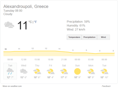 Θερμοκρασία: Από 15 έως 22 βαθμούς Κελσίου. Στα βόρεια 3 με 5 βαθμούς χαμηλότερη.
