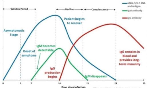 - Ειδικά για την ανίχνευση Αντισωμάτων, απαιτείται κάποιο χρονικό διάστημα ώστε αυτή να συμβεί. Όπως αναφέραμε και παραπάνω, πρώτα εμφανίζονται τα IgMόπου και ανιχνεύονται στο αίμα σε χρονικό διάστημα περίπου 6-7 ημερών από την επαφή με τον ιό, ενώ στην συνέχεια εμφανίζονται τα IgGτα οποία ανιχνεύονται μετά από περίπου 12-14 ημέρες στο αίμα του εξεταζόμενου