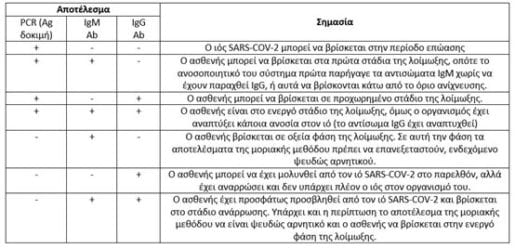 - Στην όψιμη φάση της λοίμωξης(>15 ημέρες από την έναρξη συμπτωμάτων), όπου συχνά η παρουσία του ιού δεν ανιχνεύεται από τις εκκρίσεις του ανώτερου αναπνευστικού . Αξίζει να σημειωθεί ότι η παρουσία του ιού με χρήση PCR συνεχίζει να ανιχνεύεται σε άλλα δείγματα όπως ούρα, κόπρανα κτλ.