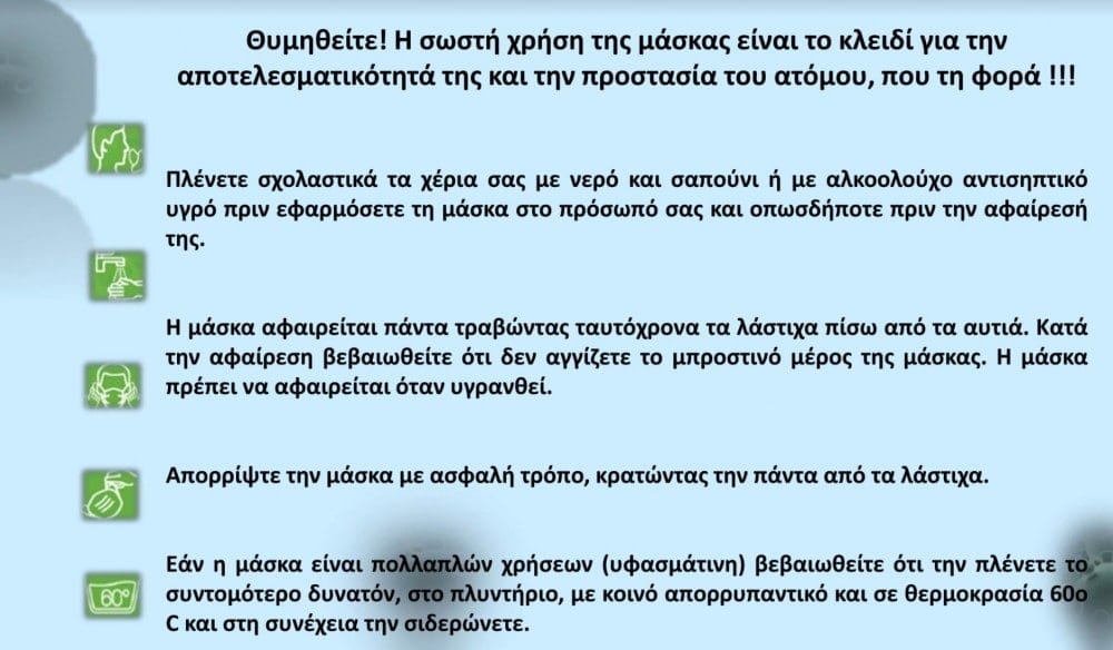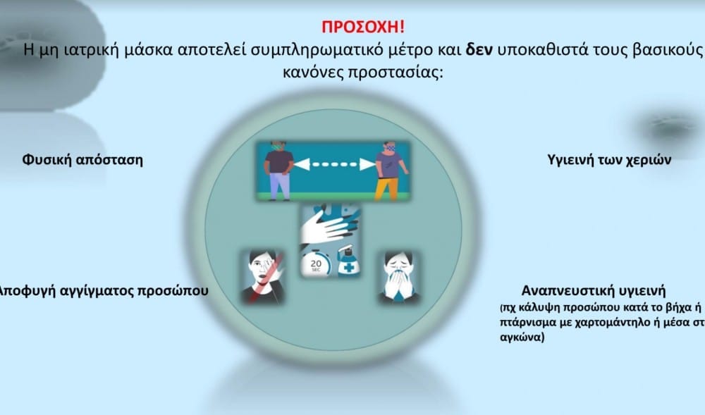 Επισημαίνεται τέλος, ότι η χρήση μη ιατρικής μάσκας αποτελεί συμπληρωματικό μέτρο και δεν υποκαθιστά τους βασικούς κανόνες προστασίας.