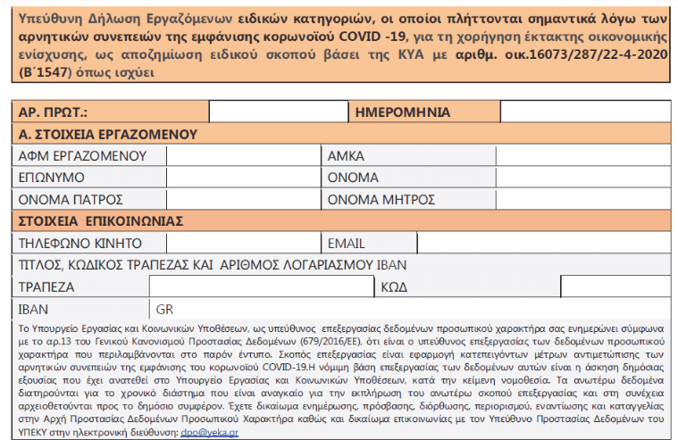 Δημοσιεύθηκε σε ΦΕΚ η απόφαση του υπουργού Εργασίας Γιάννη Βρούτση, με την οποία παρουσιάζεται η υπεύθυνη δήλωση εργαζομένων ειδικών κατηγοριών, οι οποίοι πλήττονται σημαντικά, λόγω των αρνητικών συνεπειών της εμφάνισης του κορονοϊού COVID-19, για τη χορήγηση έκτακτης οικονομικής ενίσχυσης ως αποζημίωσης ειδικού σκοπού των 800 ευρώ, βάσει της ΚΥΑ με αριθμ. οικ. 16073/287/22-4-2020 (Β΄ 1547), όπως ισχύει.