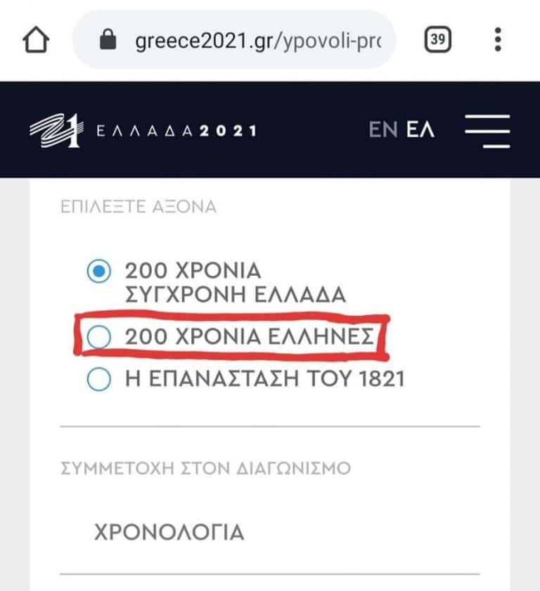Σε πεδίο στην επίσημη ιστοσελίδα της επιτροπής Ελλάδα 2021, αναφέρεται ως επιλογή «200 χρόνια Έλληνες».
