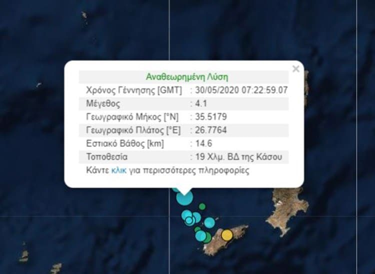 Σεισμική δόνηση μεγέθους 4,1 βαθμών της κλίμακας Ρίχτερ σημειώθηκε στις 10:22 το πρωί ανοιχτά της Κάσου.