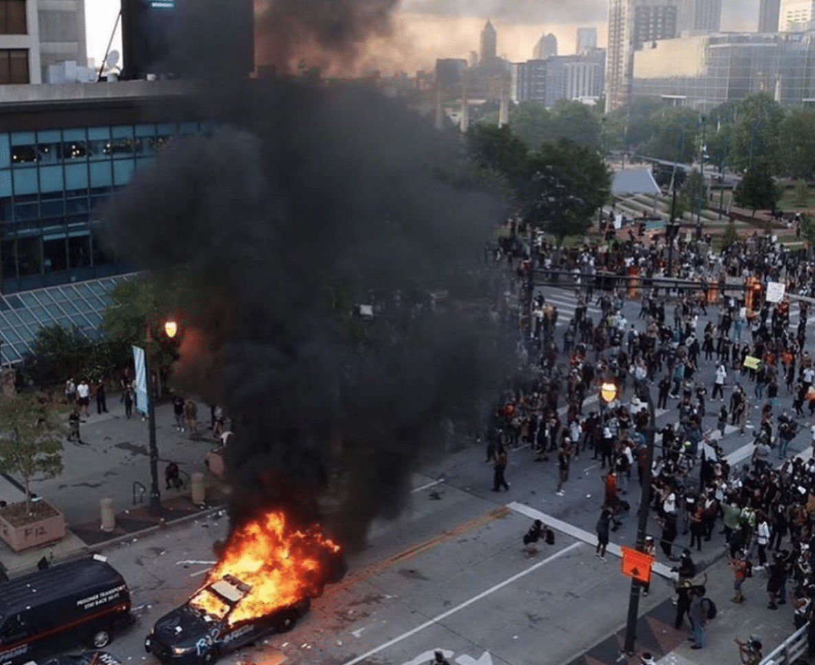 Στην Ατλάντα, η Μπέρνις Κινγκ, η μικρότερη κόρη του Μάρτιν Λούθερ Κινγκ, κάλεσε τους διαδηλωτές να επιστρέψουν στα σπίτια τους, όταν εκατοντάδες άνθρωποι έκαναν πορεία προς το κοινοβούλιο της πολιτείας και απέκλεισαν αυτοκινητόδρομο. Η διαδήλωση έγινε βίαιη όταν φωτιές άναψαν κοντά στα κεντρικά γραφεία του CNN και τζάμια έσπασαν στο λόμπι του κτιρίου. Πολλά αυτοκίνητα, μεταξύ τους και τουλάχιστον ένα περιπολικό, κάηκαν.
