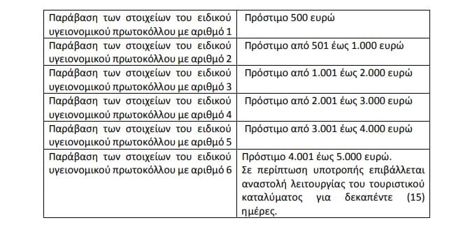 Στα φυσικά ή νομικά πρόσωπα που παραβιάζουν τους όρους των ειδικών πρωτοκόλλων υγειονομικού περιεχομένου όπως αποτυπώνονται στα Παραρτήματα της απόφασης αυτής επιβάλλεται με αιτιολογημένη πράξη του Προϊσταμένου της οικείας Περιφερειακής Υπηρεσίας Τουρισμού του Υπουργείου Τουρισμού, διοικητικό πρόστιμο από πεντακόσια (500) ευρώ έως πέντε χιλιάδες (5.000) ευρώ και αναστολή λειτουργίας της τουριστικής επιχείρησης για χρονικό διάστημα από δεκαπέντε (15) έως ενενήντα (90) ημέρες.